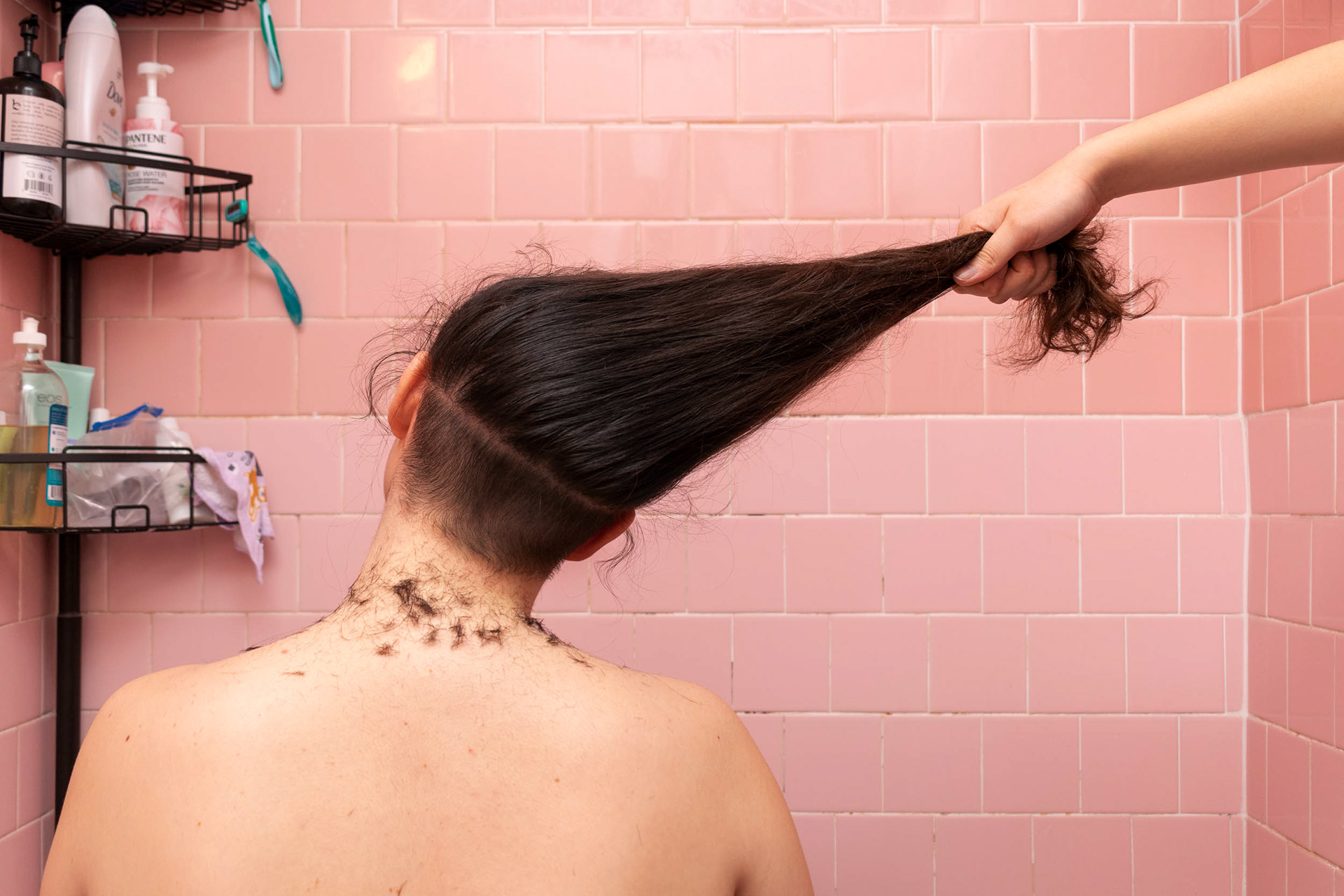 haircuts done in the privacy of our homes amplify community support & alternative styles. through conversation, my collaborators and i develop trust to produce images authentic to their experiences. hairstyles, accessories, length, & color act as unspoken signals to other Queer people of our generation. each person gives me a part of their hair and i preserve their various hair phases through an ever-growing link of sculptures. through collaboration with Queer people in generation-z, the process & work amplifies freedom of expression through their hair.
